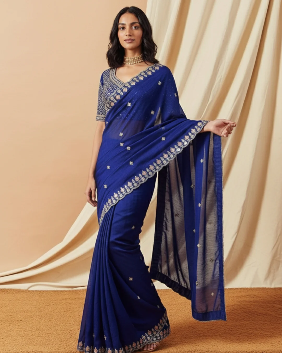 The Cobalt Zari is a love letter to bold, regal sophistication. Moving away from understated tones, this masterpiece celebrates the rich, commanding presence of deep, jewel-toned hues. Crafted from luxurious Fendy Silk, the saree acts as a radiant canvas for intricate bead, thread, and sequin work, creating a stunning scalloped border that catches the light beautifully. Designed to drape flawlessly against your silhouette, the fabric promises absolute comfort while embodying pure sophistication, making it an exquisite choice for evening soirées and grand celebrations.