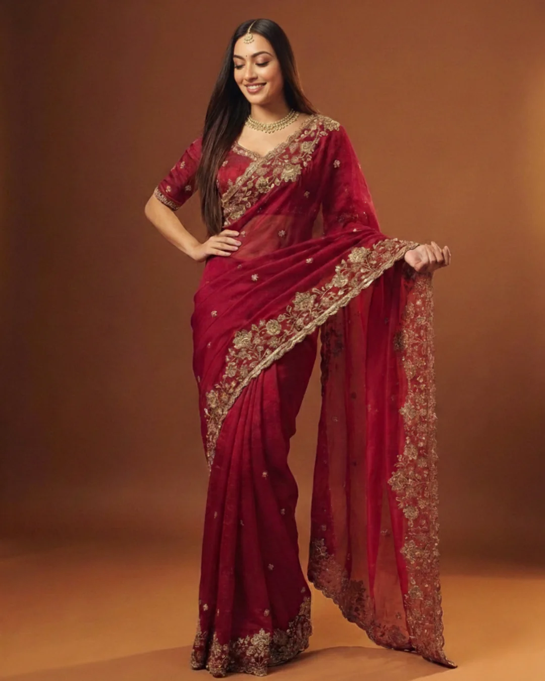 Tradition and poise are key to elevating this look. As seen on our muse, pair this rich crimson hue with statement Polki, Kundan, or Antique Gold jewellery to create a striking, regal aesthetic. Keep the makeup classic with a bold red or deep nude lip, and style the hair in a sleek, elegant bun to let the saree's intricate border take center stage.