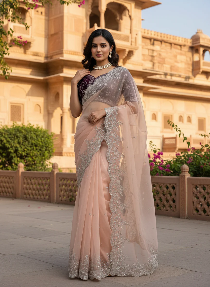 Channel the "Old Money" aesthetic. As seen on our muse, this look is incomplete without Pearls. Pair it with a multi-string pearl choker and keep the hair in soft waves. The contrast of the Velvet blouse against the sheer Organza is the statement—let it shine.