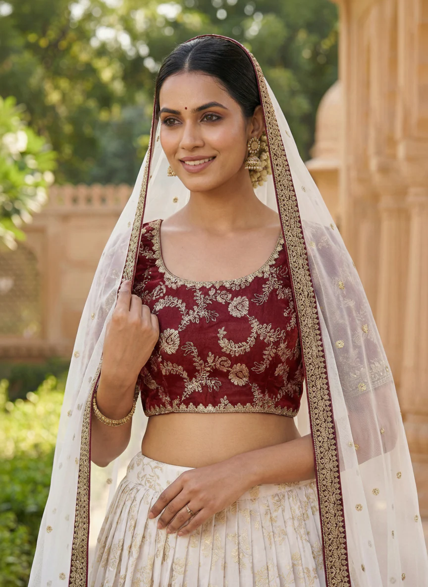 Gulnaar Ivory & Maroon Banarasi Lehenga Set