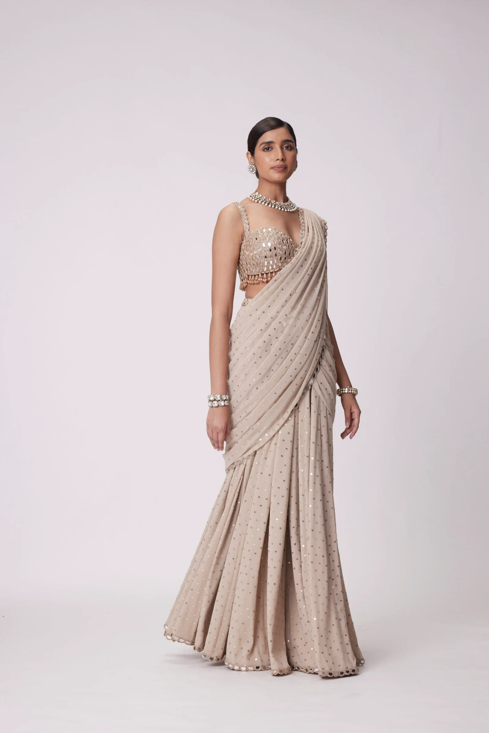 Crafted from fluid Premium Faux Georgette in a sophisticated Nude/Beige palette, the fabric is embellished with intricate Thread and Sequin work, scattered across the drape to catch the light and mimic the glint of vintage mirrors. The design prioritizes comfort without compromising on the "couture" look, featuring a concealed elastic waistband and side zip for a flawless, curve-hugging fit.