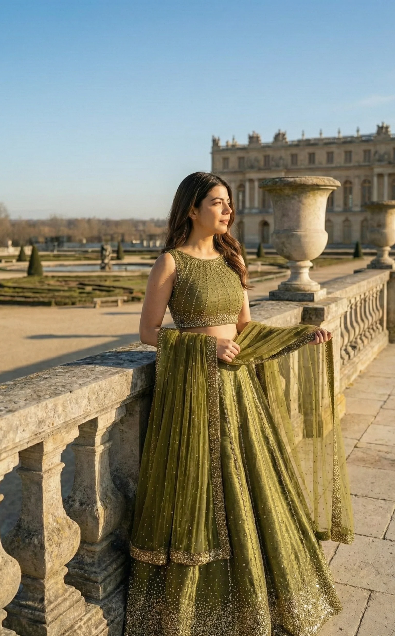 Embrace the earthy allure of The Aranya. This captivating ensemble is crafted from Heavy Thai Silk, chosen for its smooth, structured drape and opulent finish. The highlight of this piece is the intricate Sequins Work that catches the light with every movement, mimicking the glimmer of sunlight through leaves. With a generous 3.5-meter flair and attached can-can, the lehenga holds a regal, voluminous shape that commands attention. Paired with a heavily detailed blouse and a shimmering net dupatta, this set balances traditional grandeur with a fresh, couture aesthetic.