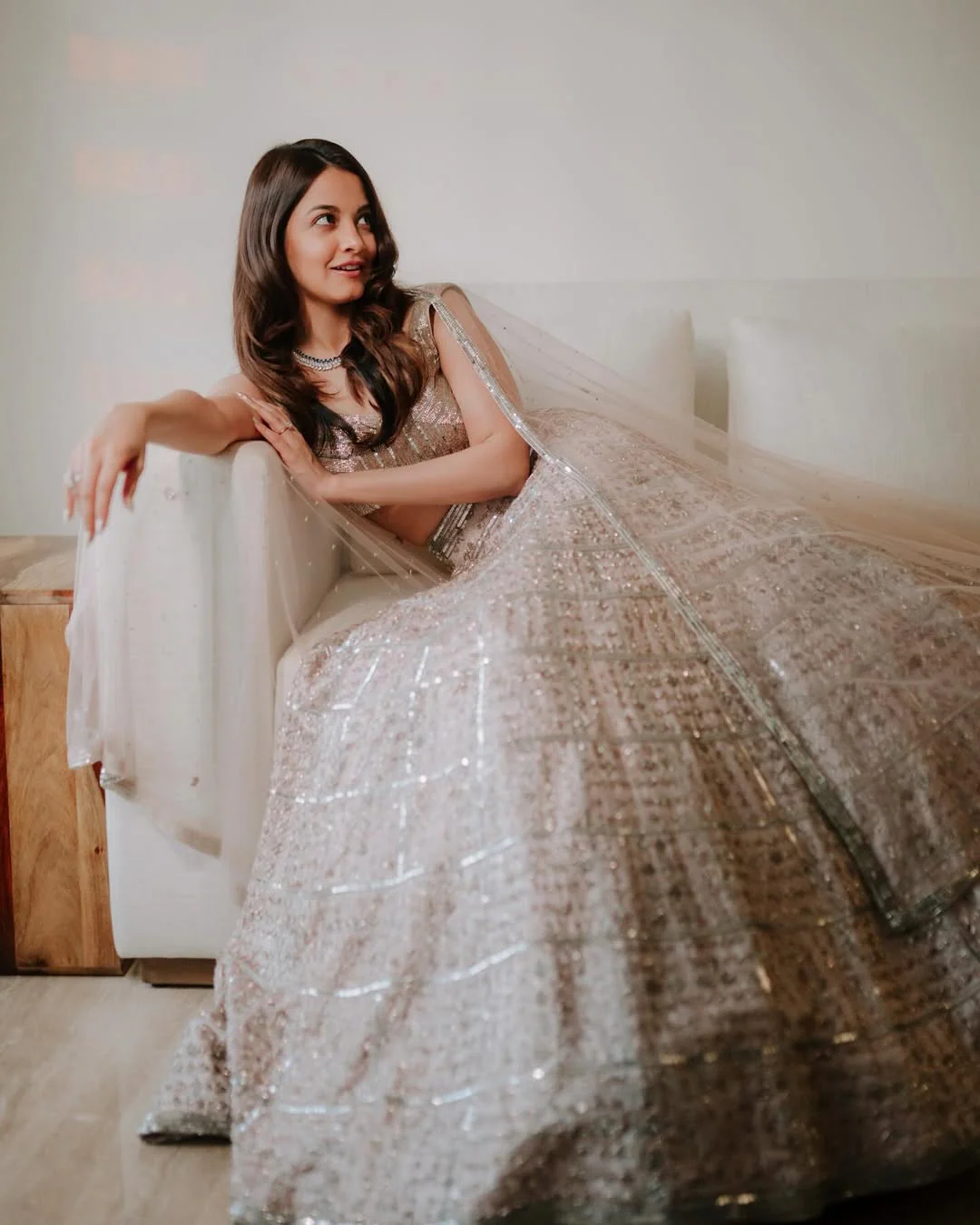 This lehenga is a jewel in itself, so let the shimmer do the talking. Pair it with Diamond or Polki jewelry to match the metallic champagne tones. Keep the hair in Old Hollywood waves (as seen on our muse) to balance the high-octane sparkle with modern sophistication.